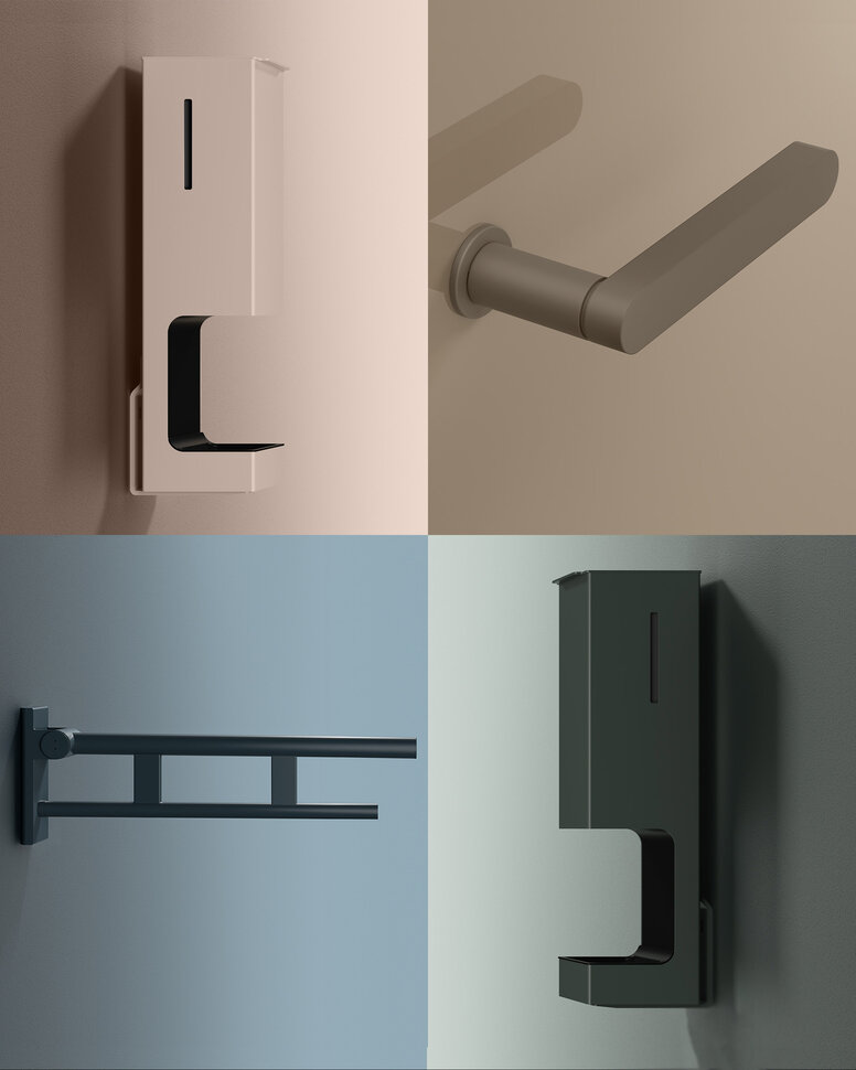 Passend zu den individuell gepulverten Sanitärlösungen sind ebenfalls Beschläge in der Wunschfarbe erhältlich. Mit Drückern aus dem System 270 in Kombination mit System 900 schaffen Sie einmalige Raumkonzepte von der Tür bis ins Bad.