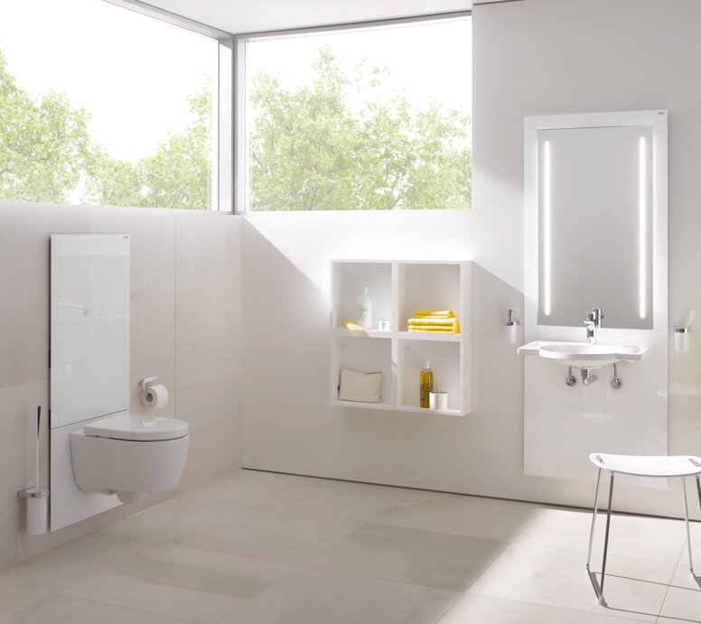 Kombinieren Sie dazu Produkte, die funktionale Anforderungen erfüllen, mit einem gestalterischen Anspruch. Die Auswahl sollte stets im Kontext des Gesamtfarbkonzepts erfolgen, um sowohl die Normanforderungen als auch die ästhetischen Vorstellungen der AuftraggeberInnen zu erfüllen. Nähere Informationen zur demenzgerechten Sanitärraumgestaltung haben wir in diesem Artikel zusammengetragen.