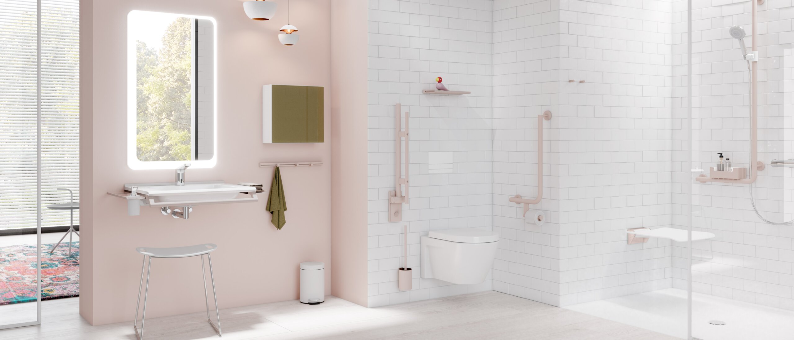 Barrierefreie Badezimmer, im Sinne des Universal Designs, sind für Menschen mit verschiedenen körperlichen oder kognitiven Einschränkungen konzipiert. Ein barrierefreies Bad sollte von allen Personen komfortabel genutzt werden können. Daher ist es von Vorteil, wenn es über Haltegriffe, Duschsitze, höhenverstellbare WCs, barrierefreie Waschtische, ausreichend Ablagemöglichkeiten, Stützklappgriffe sowie mobile Sitzgelegenheiten und nützliche Accessoires verfügt.