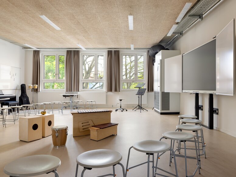 Die Lernräume selbst sind zurückhaltend gestaltet, um die Konzentration zu fördern. Die breiten, flexibel gestaltbaren Flure beherbergen die Garderoben und bieten offene Rückzugsbereiche zum Lernen und Forschen. Im Erdgeschoss befinden sich der großzügige Eingangsbereich und die Mensa, die durch ihre Lage im öffentlich zugänglichen Bereich des Schulgebäudes auch außerhalb der Schulzeiten genutzt werden kann. Im 3. Obergeschoss des Horts lässt sich eine offengestaltete Fläche zur Aula umfunktionieren, die auch für größere Schulveranstaltungen genutzt werden kann. Die variablen Grundrisse prägen das neue Gebäudeensemble auf allen Ebenen und sind auch im Hinblick auf die Barrierefreiheit von großer Bedeutung.
