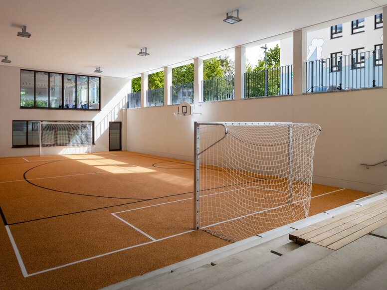 Beide Gebäude sind im Erdgeschoss aufgeständert, so dass attraktive überdachte Spiel- und Pausenflächen entstehen. Unter den Gebäuden befinden sich multifunktionale Flächen und zwei Kleinspielfelder, die vom Schulhof über eine tribünenartige Treppenanlage erreichbar sind. Die natürliche Zonierung der Aktionsflächen im Erdgeschoss in Kombination mit attraktiven Spielflächen auf dem Dach ist ein wichtiger Bestandteil des Entwurfskonzeptes. Auf dem dicht bebauten Grundstück waren die Anforderungen an die Mindestgröße der Freiflächen nur schwer zu realisieren.
