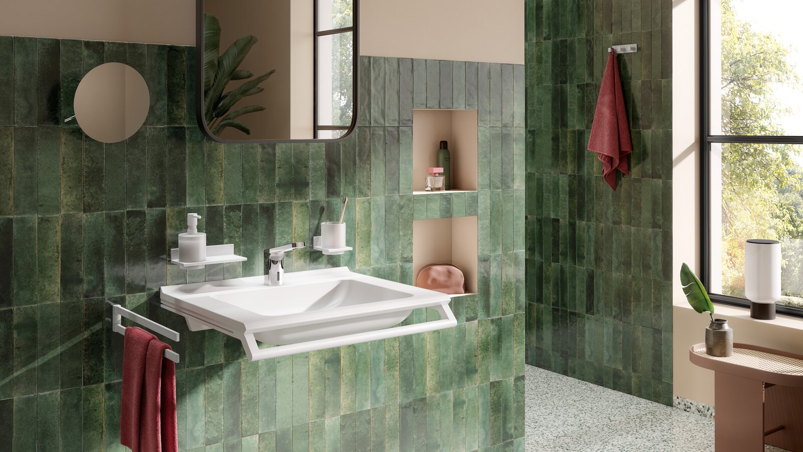Auch die richtigen Accessoires lassen kleine Bäder optisch größer wirken. Die Produkte aus dem System 800 in der Ausführung Weiß matt sorgen für visuelle Leichtigkeit. Dank der hellen Farbgebung reflektieren sie das Licht optimal und erzeugen ein Gefühl von Weite und Offenheit, das auch in kleineren Räumen für eine freundliche und einladende Atmosphäre sorgt, ideal für temporäres Wohnen.