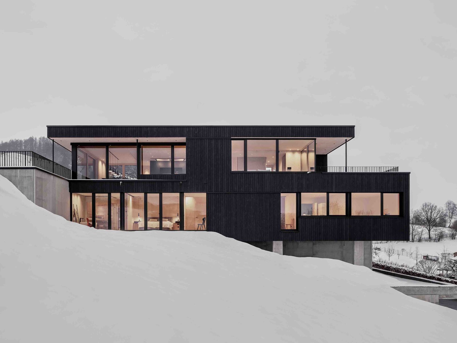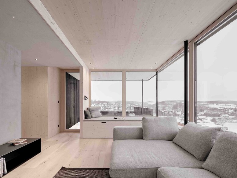 Das architektonische Konzept basiert auf dem Dialog der Materialien. Sichtbeton als Fundament ist dauerhaft, lasttragend und robust. Dem gegenüber steht das warme Holz der oberen Geschosse, das für Leichtigkeit, Offenheit und Lebensnähe steht. „Diese Gegensätze sind kein Widerspruch, sondern die eigentliche Stärke des Hauses“, betont Schönauer. In diesem Spannungsfeld entfaltet sich eine Architektur, die sowohl Festigkeit als auch Transparenz ausstrahlt. Großformatige Glasflächen, präzise gesetzte Durchblicke und ein Sitzfenster mit Panoramablick verweben den Innenraum eng mit der Landschaft. Innen und Außen bilden ein fließendes Kontinuum.