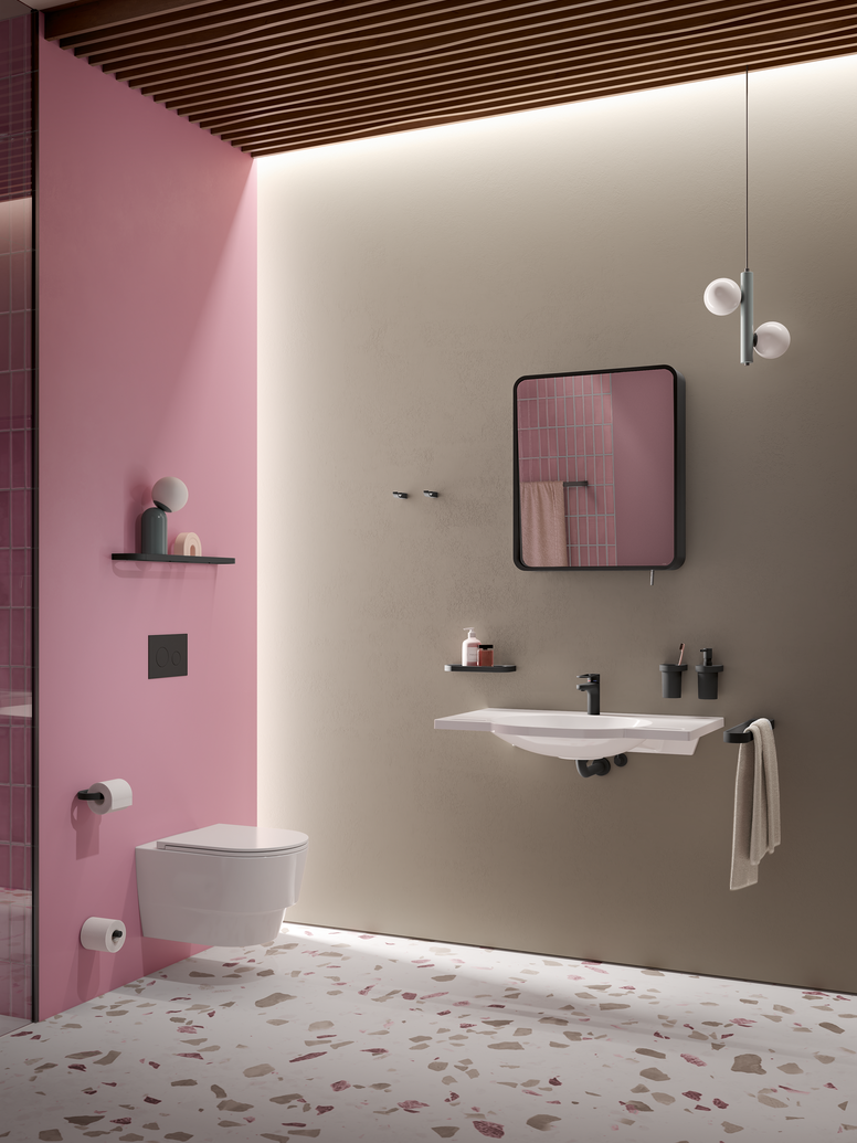 In Kombination mit Waschtisch und Spiegel setzen die Accessoires in der neuen Ausführung in Schwarz matt einen kontrastreichen Akzent.