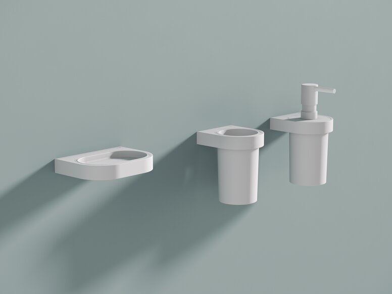 Edles Ensemble in Weiß matt: Seifenablage, Becher und Seifenspender.