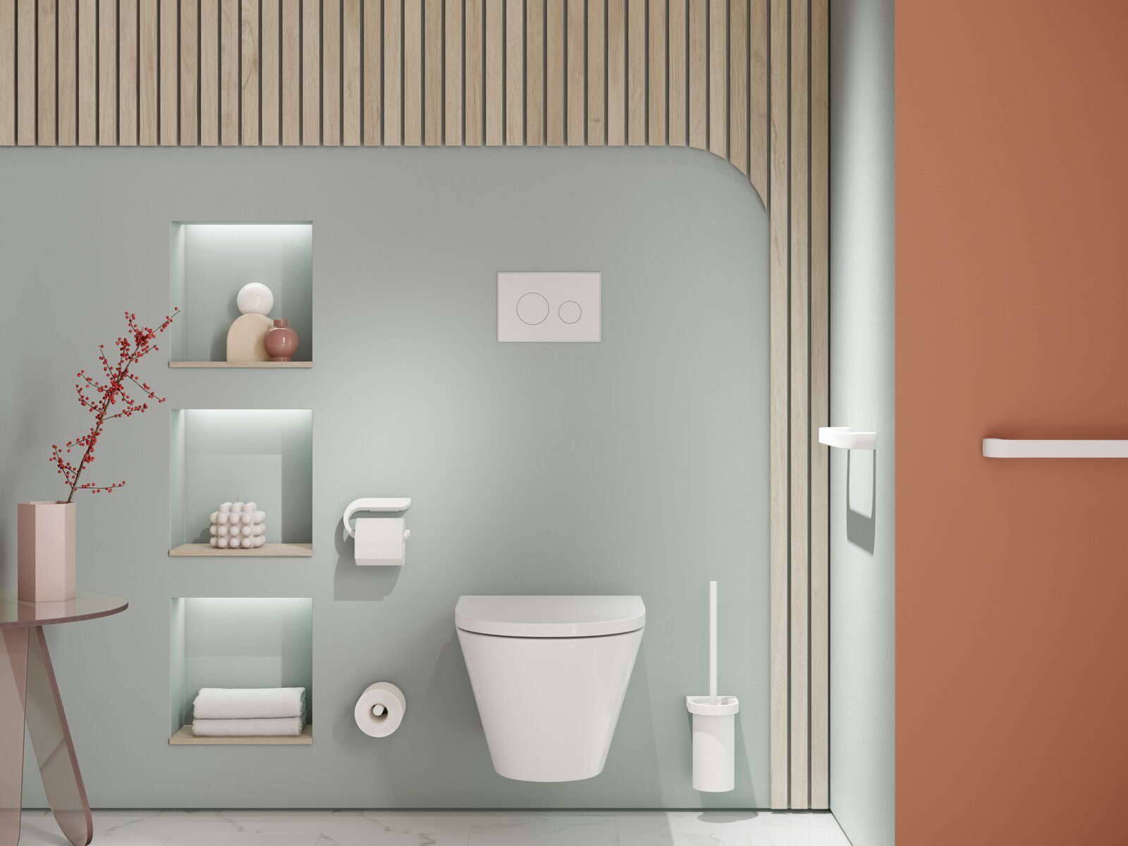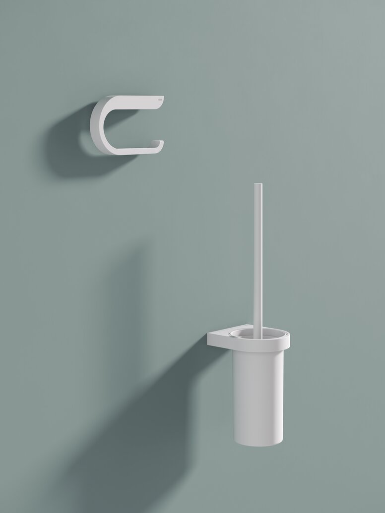 WC- Bürstengarnitur und WC-Papierhalter sind formal so reduziert wie möglich und wirken zeitlos elegant. Die neue, pulverbeschichtete Oberfläche in Weiß matt oder Schwarz matt ist haptisch ausgesprochen angenehm und fügt dem Entwurf einen emotionalen Aspekt hinzu.