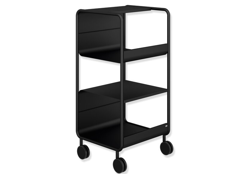 Der HEWI Beistellwagen ist mit pulverbeschichteten Oberflächen in hochglänzendem Weiß oder in mattem Schwarz mit edlen Chromelementen erhältlich.