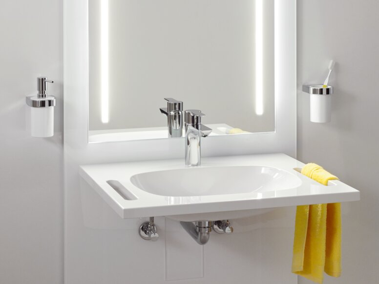 • Von Waschtisch über Accessoires bis hin zu Armaturen, Stützklappgriffen und -sitzen