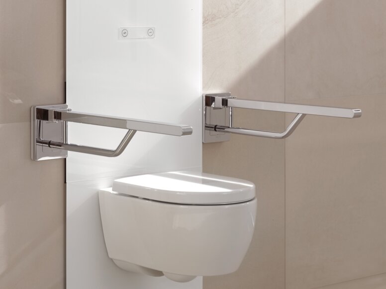 Das WC-Modul lässt sich wahlweise um Stützklappgriffe ergänzen. Diese sind entweder rechts oder links vom WC bzw. auf beiden Seiten montierbar. Zudem ist auch eine nachträgliche Montage möglich. Mit dem WC-Modul S 50 sind sämtliche Stützklappgriffe von HEWI kombinierbar. Die Stützklappgriffe sind so montierbar, dass eine normgerechte Ausstattung eines Bades möglich ist.