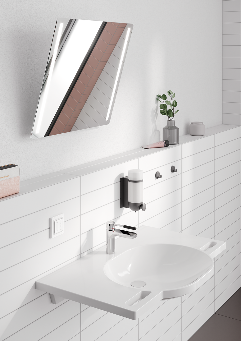 • Von Waschtisch über Accessoires bis hin zu Armaturen, Stützklappgriffen und -sitzen