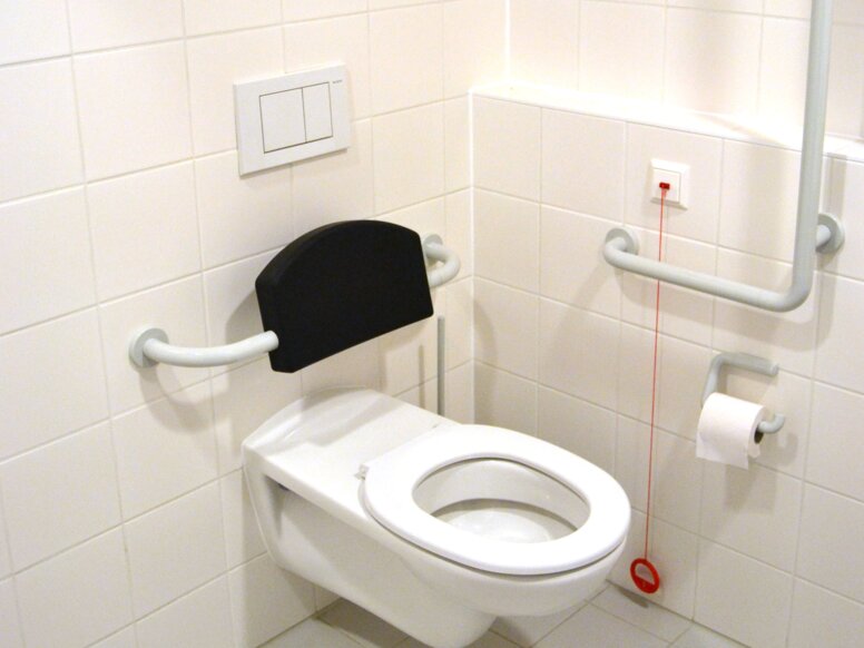 Im Bad wurde LifeSystem von HEWI eingesetzt. Stützklappgriffe an Waschtisch und WC geben Halt und unterstützen die Bewegungsabläufe. Die Dusche verfügt über ein Relingsystem. Dies bietet den Vorteil, dass es sowohl als stabile Haltemöglichkeit genutzt als auch bei Bedarf ein Duschsitz eingehängt werden kann. Alles im Bad ist so konzipiert, dass es problemlos für einen Rollstuhlfahrer nutzbar ist: Der Waschtisch ist unterfahrbar, die Toilette verfügt über eine Rückstütze, zudem ist dort ein Stützklappgriff mit einer zweiten Griffebene angebracht, welche das Umsetzen vom Rollstuhl auf das WC erleichtert.