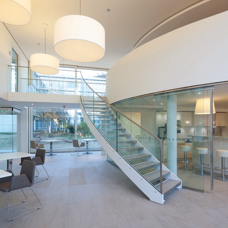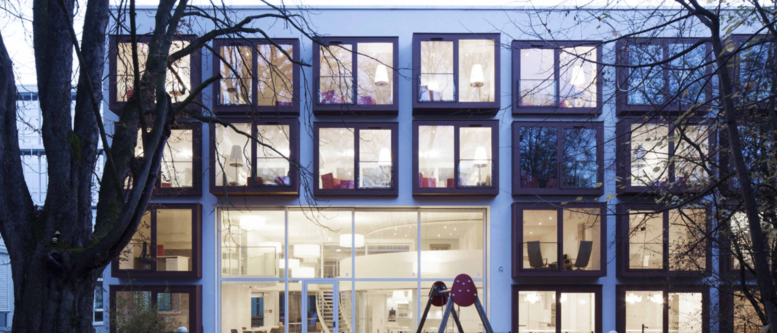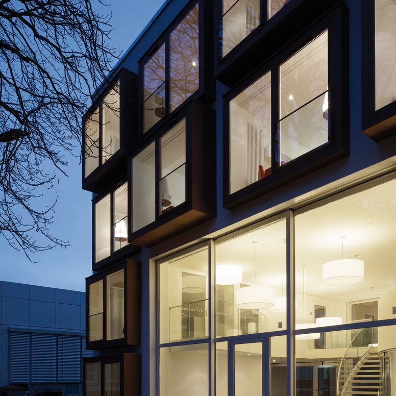 Im Außenbereich wurden Elemente in Rostbraun verwendet, um so eine Verbindung zur Umgebung zu schaffen – dem angrenzenden, denkmalgeschützten Zenetti-Bau, der in Sichtklinker ausgeführt ist, sowie den alten Baumbeständen auf dem Gelände selbst. Als zentraler Ort des Gebäudes ist der Gemeinschaftsraum konzipiert, der sich über beide Etagen erstreckt.