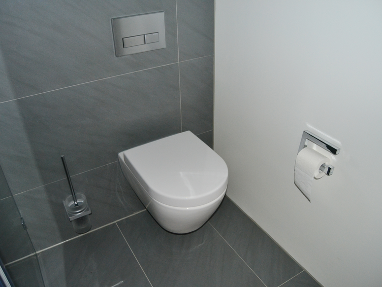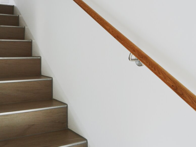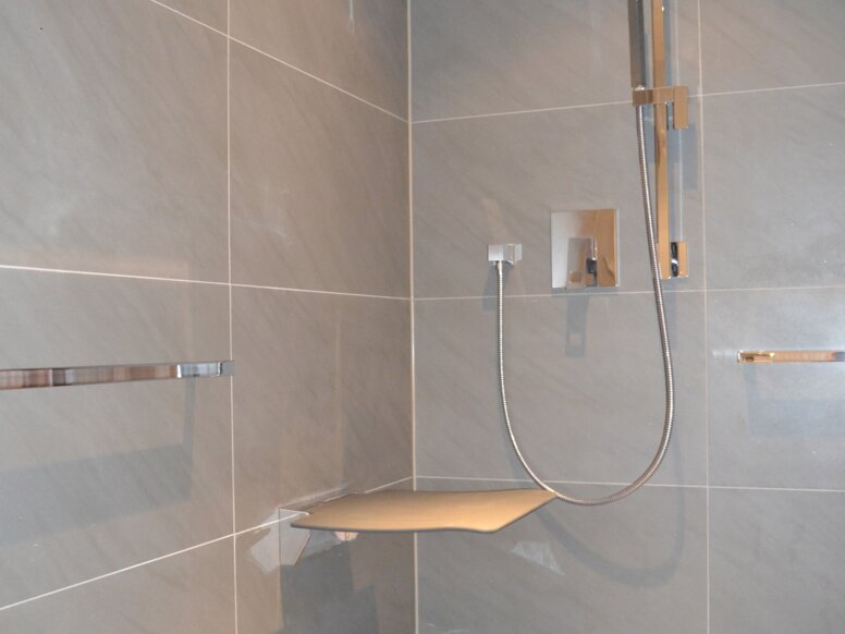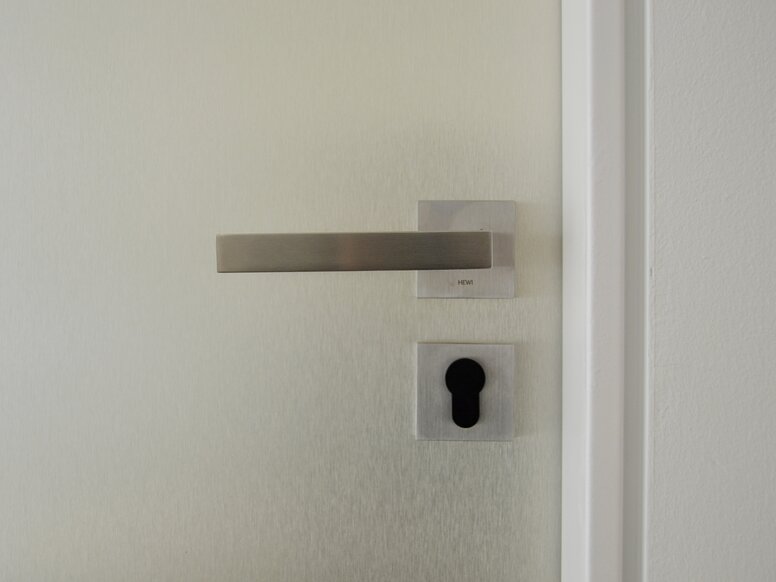 Die zurückgenommene Gestaltung setzt sich in den Einzimmer-Apartments bis in die Badezimmer fort. In das helle Ambiente fügen sich die Sanitär-Accessoires von System 100 ein. Die Einrichtung des Hauses wurde so gewählt, dass sie pflegeleicht und hochwertig zu gleich ist. In den Bädern finden sich daher hochglänzende Chromelemente, an den Türen und Fenster wurden Beschläge von System 100 aus hochwertigem, matt geschliffenem Edelstahl eingesetzt. Das Haus verfügt zudem über ein barrierefrei gestaltetes Apartment, das im Erdgeschoss angesiedelt ist. Im barrierefreien Bad wurden Haltegriffe und Stützklappgriffe von System 100 eingesetzt. Zudem wurde die Dusche mit einem klappbaren Sitz ausgestattet. Auch hier unterstreichen die eingesetzten Produkte die zurückhaltende Gestaltung des Hauses.