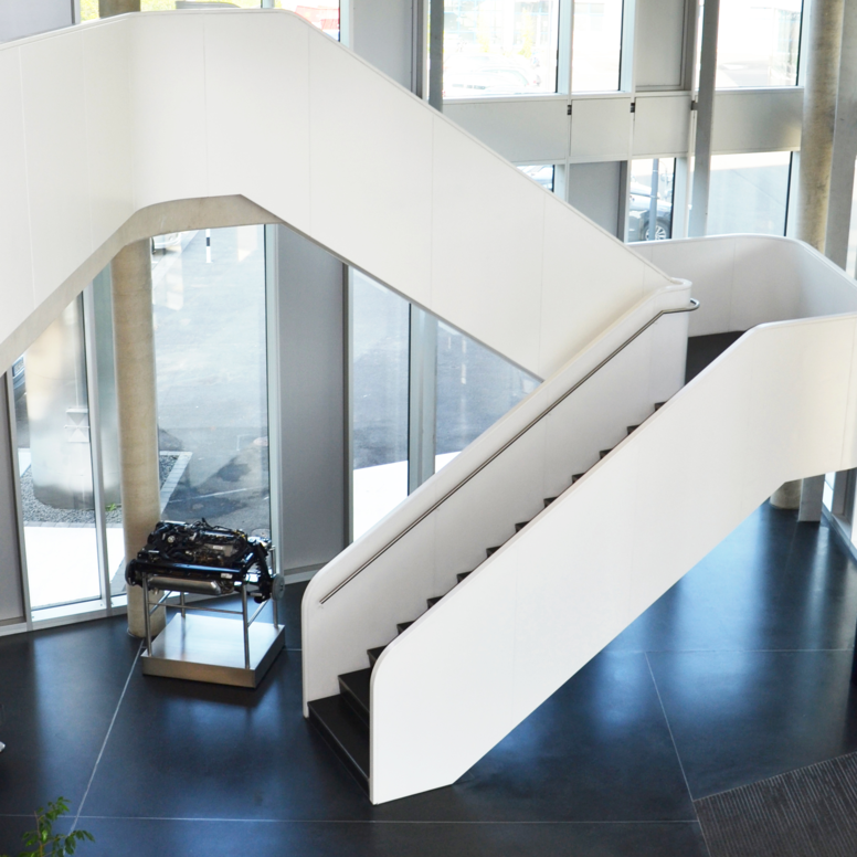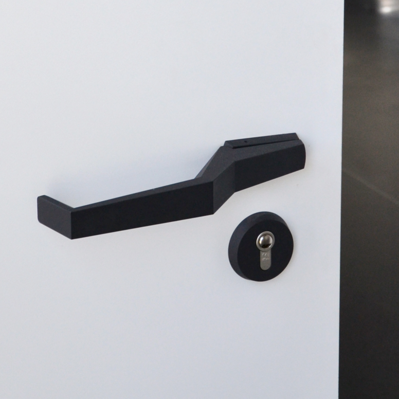 Im Gegensatz dazu steht der Verwaltungs- und Seminarkomplex, der transparent mit einer Glasfassade gestaltet ist und beispielsweise durch eine dezentral angelegte Technik ein Höchstmaß an flexibler Nutzung und Vernetzung bietet. Der Gegensatz von offen und geschlossen findet sich in den gewählten Schwarz-Weiß-Kontrasten wieder. Im Laborbereich sind die Wände schwarz und die Böden aus weißem Epoxidharz gestaltet. Im Seminarbereich dagegen sind die Wände weiß und die Böden mit schwarzem Teppich ausgelegt. Die dynamische Form des Verwaltungsgebäudes findet sich in der fließenden Form der Türdrücker wieder. Hier wurde Serie 120 in Schwarz eingesetzt.