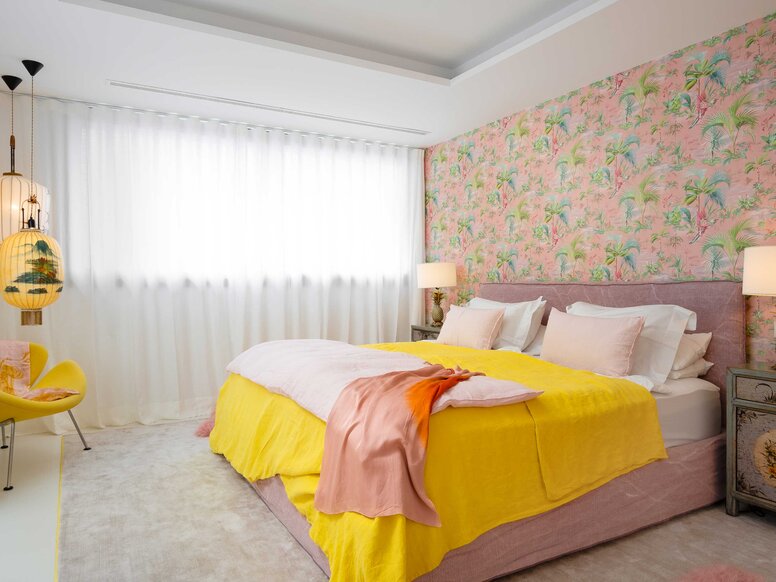 The high-quality interior design of the guest house puts colours centre stage. The combination of minimalist fittings, modern lines and large windows that open up the rooms creates a design concept that invites guests to dream. This modern house is surrounded by tall trees that offer protection from the Spanish sun, as well as the turquoise-blue Mediterranean Sea. The colour of the sun is reflected in various accents throughout the interior design of the holiday home. Whether in carpets, pillows, bedding or the iconic door handle 111 from HEWI in mustard yellow.