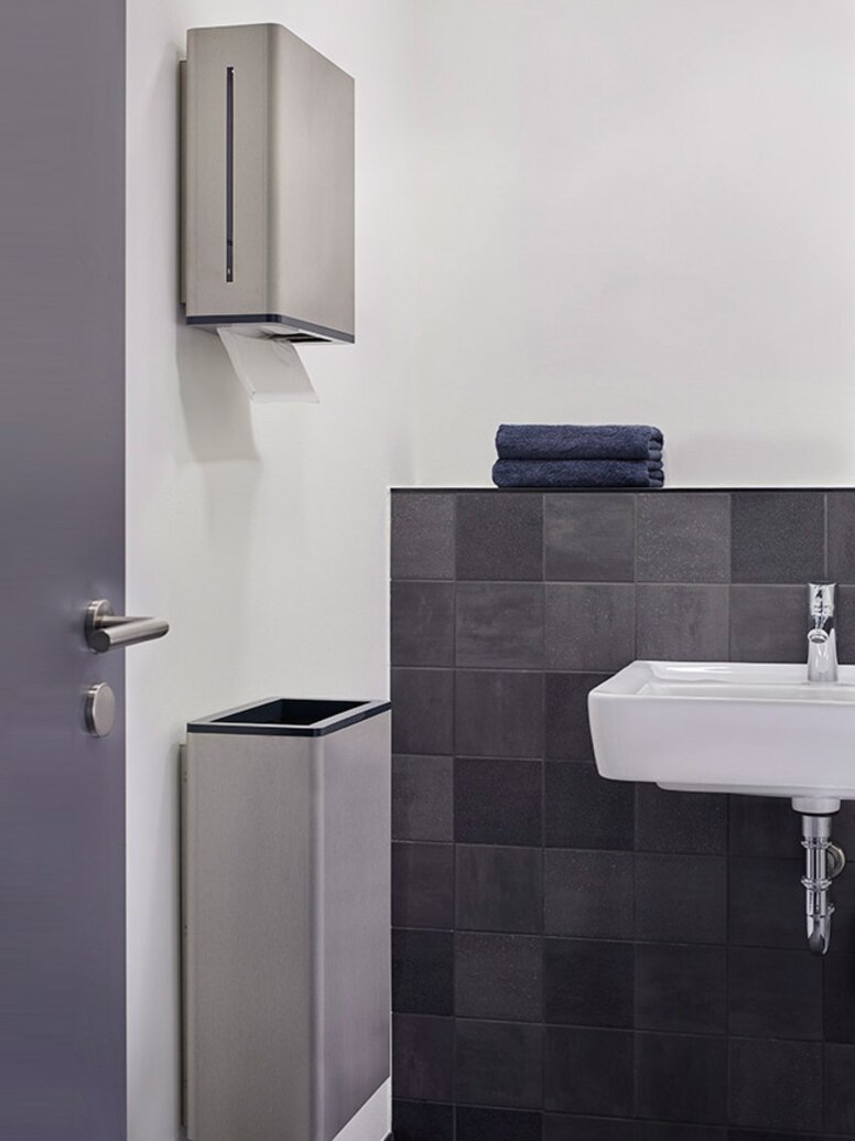 Les architectes ont choisi la gamme 805 de HEWI pour les espaces sanitaires sans barrières. La conception réduite de la série 805 permet de créer une pièce claire. Jusqu'au moindre détail, cette série montre qu'une bonne conception et des fonctions intelligentes forment une unité. Par exemple, la zone fonctionnelle des systèmes de distribution est en polyamide de haute qualité avec un contraste de couleur.