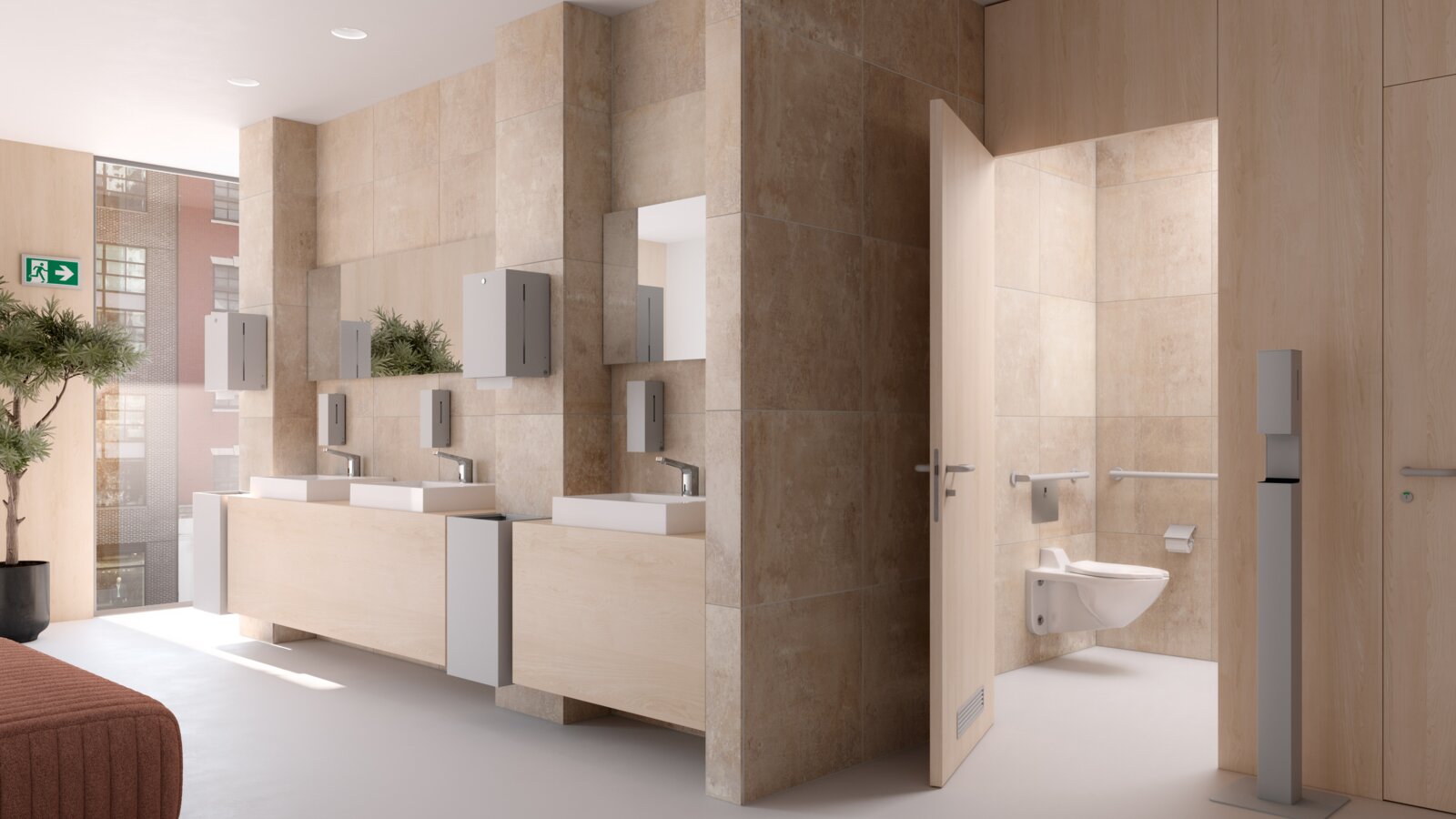 La version sur pied du distributeur de produit désinfectant peut être combinée avec d'autres solutions sanitaires. Les distributeurs de savon et les distributeurs de produit désinfectant muraux, les distributeurs de serviettes en papier et les poubelles sont disponibles dans les mêmes designs, ce qui permet d'obtenir un ensemble harmonieux dans la pièce.