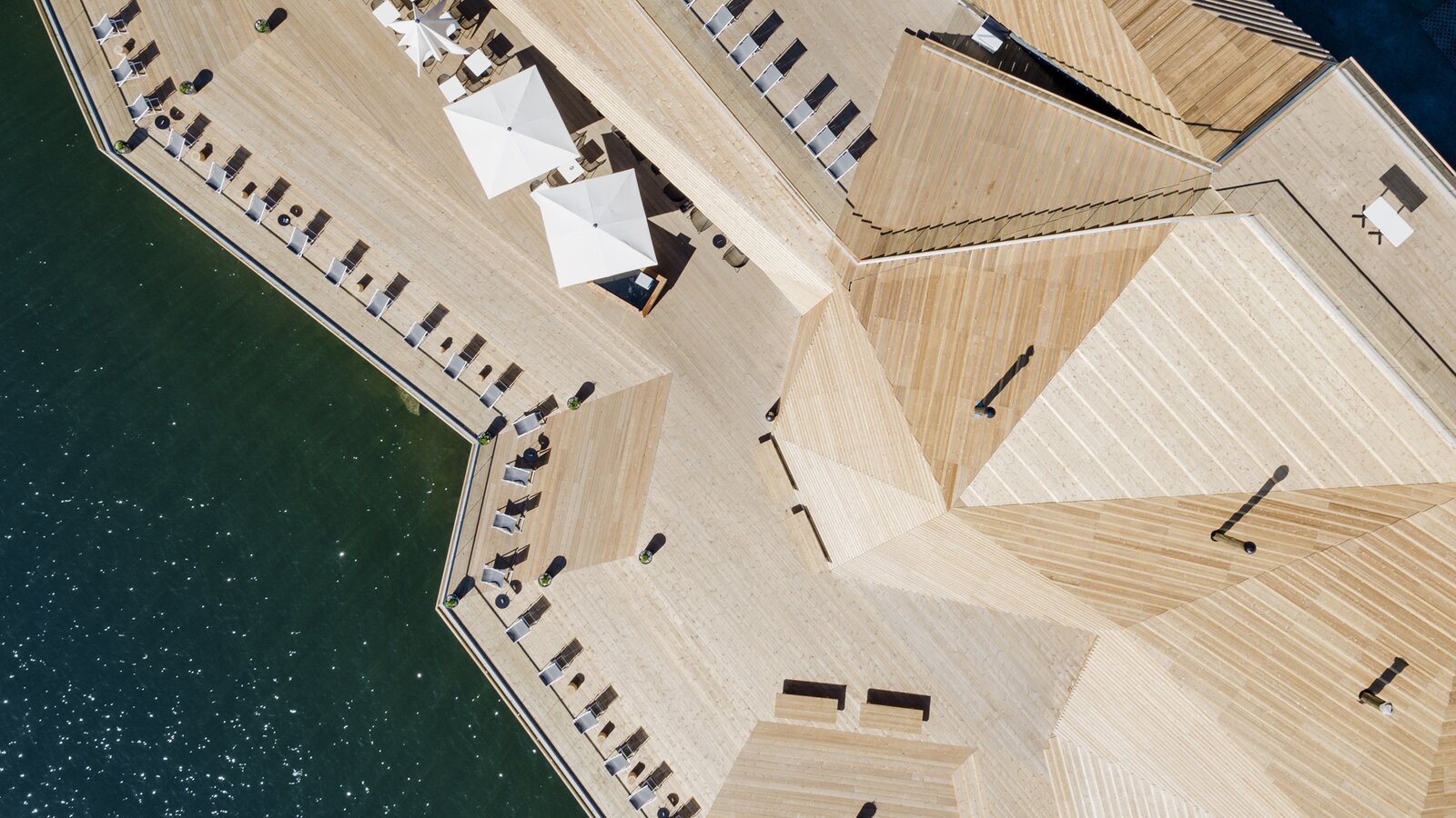 Deze zwarte doos is omgeven door een omhulsel van symmetrisch geplaatste houten stutten. Deze hebben verschillende functies. Ze bieden bezoekers bescherming tegen ongewenste blikken. Beperk echter niet het uitzicht op de zee vanuit het interieur. Het gebouw vlakt af naar de zee en biedt bezoekers een panoramisch terras. Gedeeltelijk ligt dit op het water, zodat men het geluid van de zee onder de voeten kan horen