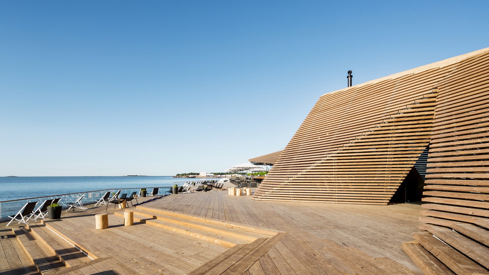 De traditionele sauna bevindt zich in een houten gebouw direct aan de oever. Het heuvelachtige silhouet van de sauna doet denken aan het Finse kustlandschap. De gedeeltelijk hoekige contouren komen ook terug in de HEWI Serie 100 wastafel in het barrièrevrije toilet van de sauna.
