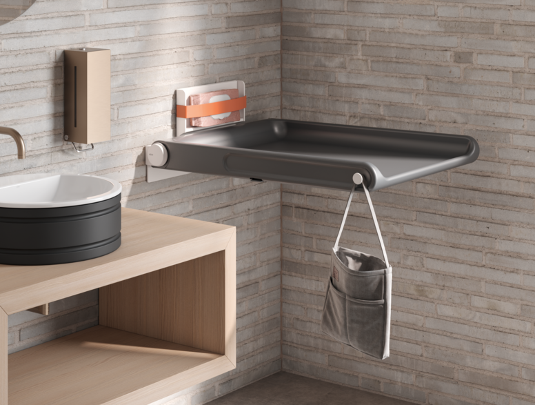 Nowy przewijak dla niemowląt HEWI łączy w sobie łatwą do czyszczenia matę wykonaną z pianki PUR w kolorze szarym stalowym z solidnymi metalowymi elementami w kolorze białym matowym. Funkcja składania z hamulcem umożliwia płynną obsługę, a boczne zaczepy i schowek na zacisk zapewniają dodatkowy komfort. Przewijak łączy w sobie najwyższe standardy bezpieczeństwa i wygodną obsługę z nowoczesnym designem, który doskonale nadaje się do zastosowania w publicznych strefach sanitarnych. Stolik do przewijania został zaprojektowany przez Holscher Design, renomowaną i wielokrotnie nagradzaną agencję zajmującą się strategicznym projektowaniem produktów z Danii, posiadającą ponad 50-letnie doświadczenie.